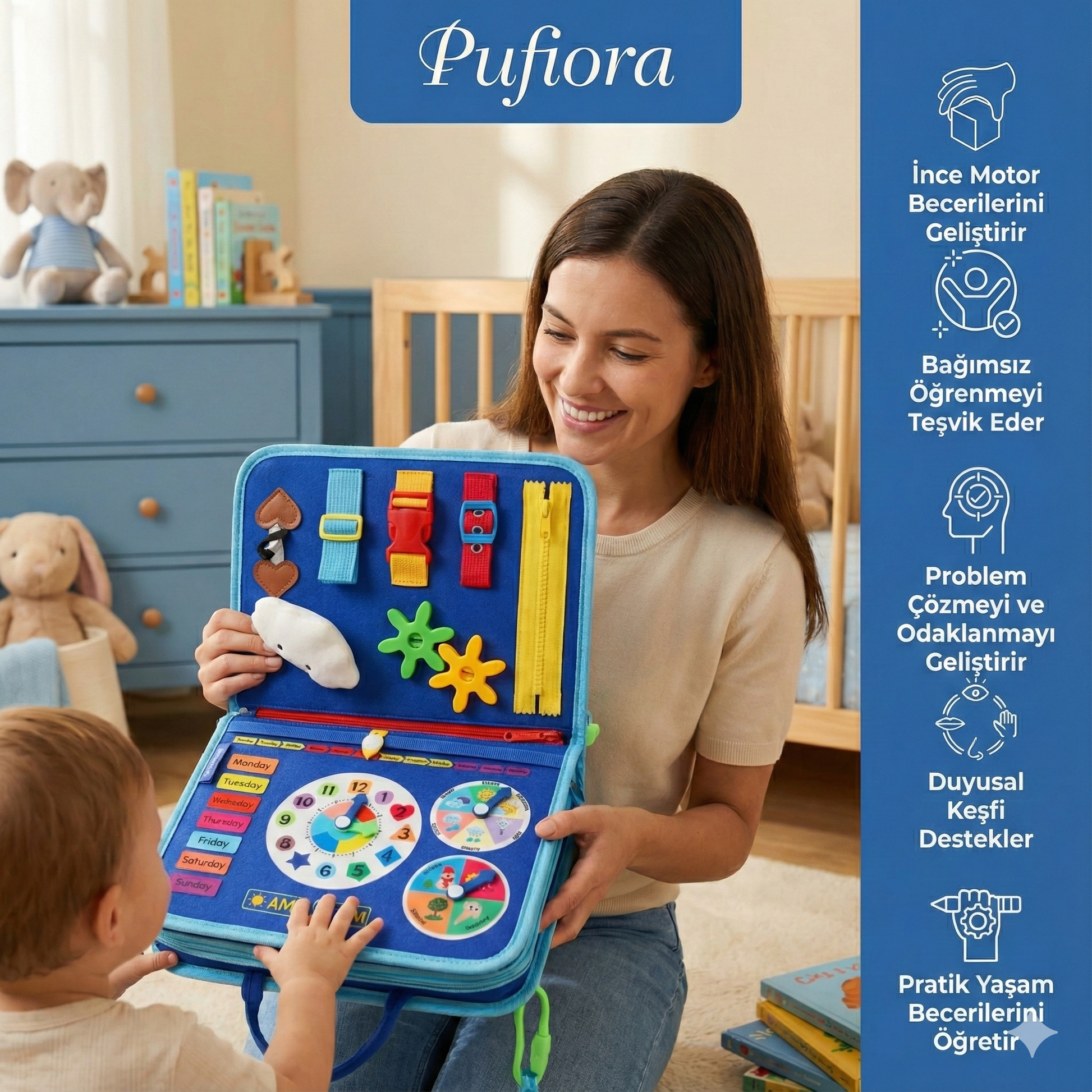Pufiora™; çocuğunuzun ince motor becerilerini, el–göz koordinasyonunu, kas gelişimini, dil becerilerini ve odaklanma süresini desteklemek için tasarlanmış bir gelişim ürünüdür.